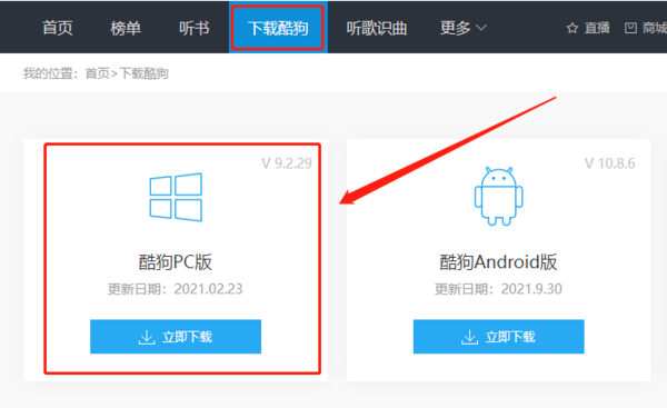 方法三:在浏览器上搜索酷狗音乐官网,在官网选择下载酷狗,找到电脑版后点击立即下载就行了。