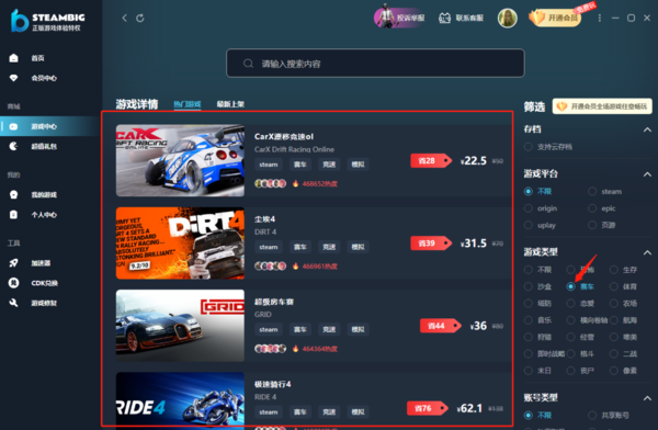 来到steambig游戏中心之后,即可在界面的右侧看到筛选像,对应地,我们进行勾选即可,比如我们在【游戏类型】中勾选【赛车】,那么中间就会为我们显示各种赛车游戏。