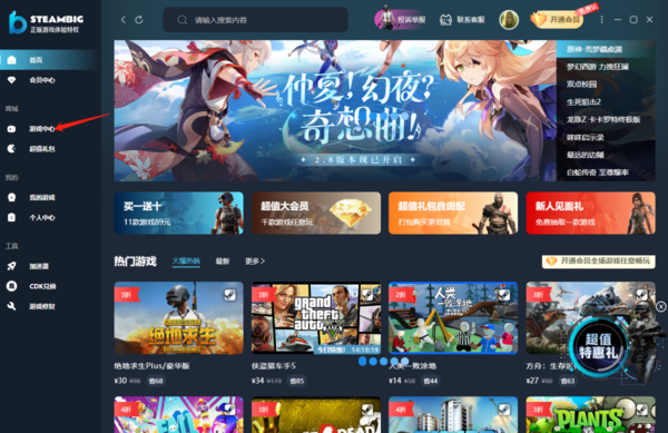 当我们进入steambig之后,在主界面左侧的菜单栏中,找到并点击【游戏中心】按钮,即可切换到steambig的游戏中心界面,里面有超级全面的游戏库,里面的游戏可谓“只有你没玩过,没有你不想玩”。