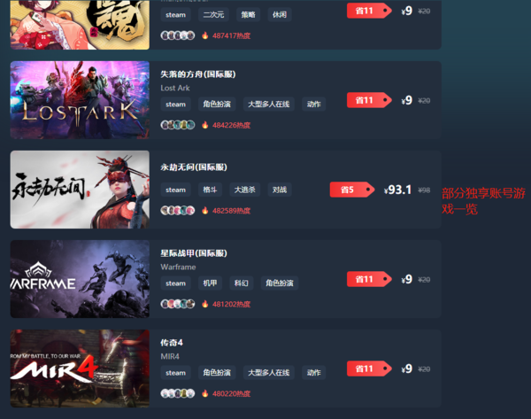 4、账号类型。主要分为共享账号、独享账号、cdkey这3个类别,这个主要看玩家自身的倾向了。