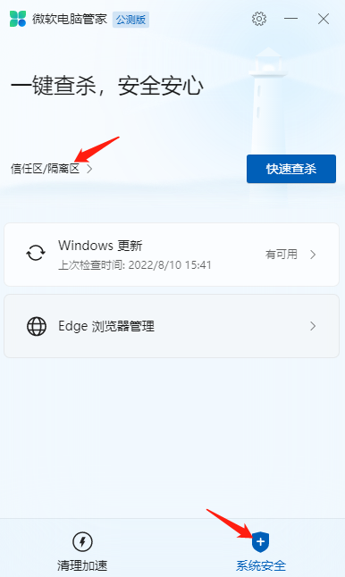 2、接着,我们可以在微软电脑管家系统安全界面中看到【信任区/隔离区】的字样,点击该区域即可进入微软电脑管家隔离区,在此我们即可看到系统威胁项和信任项。对此,可能有人会表示分不清隔离项和威胁项,下面财神爷站小编就用一定篇幅给大家简单介绍一下它们俩。