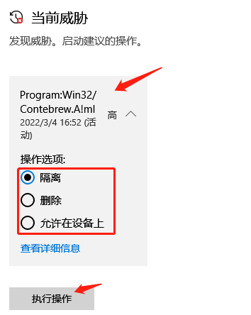 我们点击【信任区/隔离区】按钮之后,即可进入电脑系统威胁项界面;在界面中,我们可以看到有一项为【当前威胁】,在其下方可以看到电脑中的威胁项;对于我们要处理的,点击该项,接着会出现选项隔离、删除、信任,如果是我们需要用的文件,那就选【信任】;如果是恶意文件,那就点击【删除】。