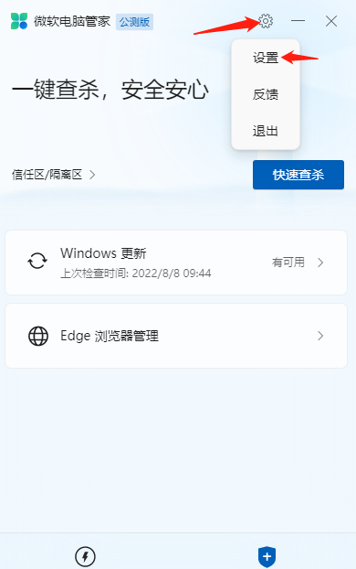 ②在主界面上,点击UI右上方的【齿轮】图标,再点击【设置】,进入微软电脑管家的设置界面。