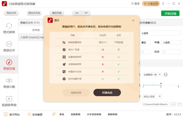 根据财神爷站小编的亲自使用经验来看,闪电音频格式转换器不付费也是可以使用的,但是功能或权限上会受到影响,比如我们不付费使用的话,每天只能够转换3个文件,而付费会员则不受数量的限制。而不付费使用的话,转换的文件还有官方的广告语,付费会员则没有。最后,付费会员还支持批量转换特权、加速转换特权以及专属技术支持。
