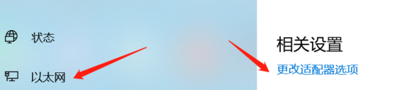 2、点击以太网并点击“更改适配器选项”,找到自己正在使用的网络图标,右键属性