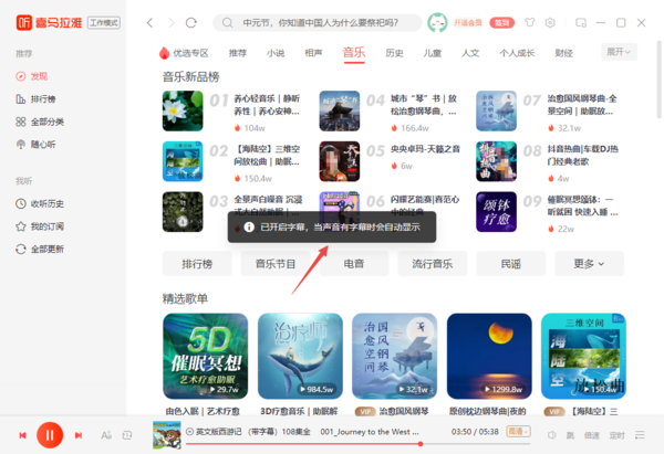 PC电脑版喜马拉雅软件能看字幕吗?小编为什么会抛出这个问题呢?这是因为很多时候我们在使用电脑版喜马拉雅听书的时候,由于身边环境的问题或者是自己本身的问题,导致我们没有听到播放的内容,而此时如果可以看到字幕的话,那么我们就不会出现这种担心了。