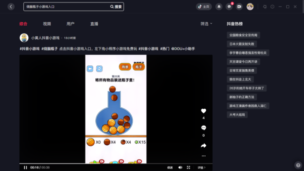 根据财神爷站小编的亲自使用以及查找本站的资料内容来看,抖音电脑版上是不可以玩小程序游戏的,手机端的很多小程序游戏我们都是无法在电脑端找到的。但是小编相信,之后抖音电脑版会逐步同步这个功能,让我们拭目以待吧。