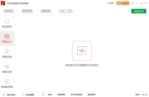 一、界面简单,我们在打开闪电音频格式转换器后,在界面中可直接看到音频格式转换、合并、压缩、分割等功能;功能好找,上手难度就会低一些。