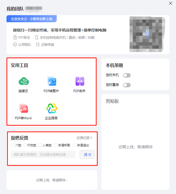 3、报修反馈。毕竟360企业安全云是以企业为单位使用的,我们可以在这里,快速向企业网管进行报修、或是反馈电脑问题,以让网管帮忙快速解决。