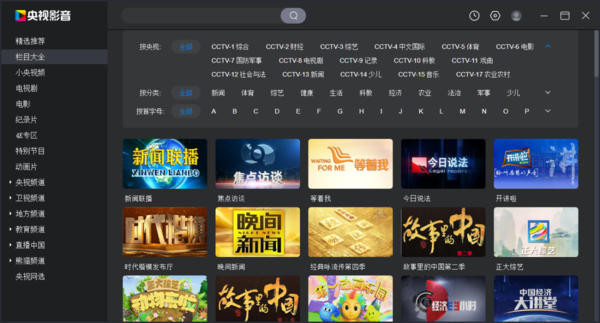 而在央视影音电脑软件当中,我们可以找到软件左侧列表中的【栏目大全】,点击进入,我们就可以在右侧的节目中看到中央电视台的央视频道列表。同时在左侧列表中,找到【央视频道】,也可以看到央视频道列表,点击就可以进行观看了。