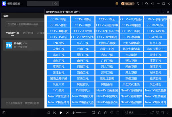 其中,恒星播放器需要我们安装第三方的看电视插件,然后就可以看电视直播了,其中电视直播节目列表中,就有中央电视台CCTV-1综合、CCTV-2财经、CCTV-3综艺、CCTV-4中文国际、CCTV-5+体育赛事,CCTV-5体育、CCTV-6电影、CCTV-7国防军事、CCTV-8电视剧、CCTV-9纪录,CCTV-10科教、CCTV-11戏曲、CCTV-12社会与法制、CCTV-13新闻,以及CCTV-14少儿、CCTV-15音乐、CCTV-17农业农村央视电视节目,点击想要观看的央视直播电视频道,即可观看电视直播。