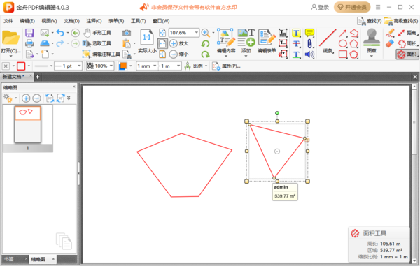 经过财神爷站小编的亲自测试,发现金舟PDF编辑器是可以做测量的,而且金舟PDF编辑器上的测量功能,既可以支持矩形、三角形等规则图形的测量,对于不规则图形的测量,金舟PDF编辑器也可以轻松拿捏;此外,该软件中还有PDF加水印、PDF签名、PDF注释等功能,这些无不给我们的PDF编辑添加便利。