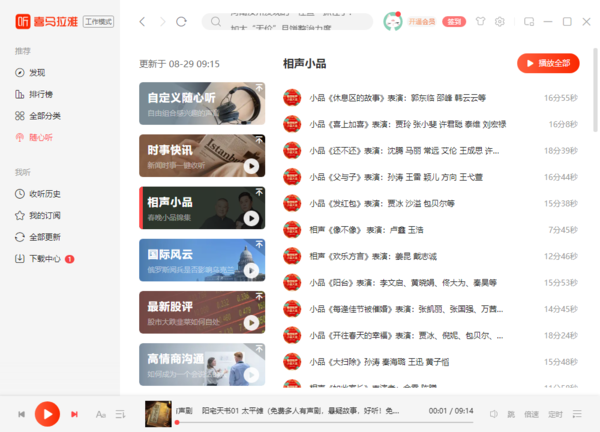 ②相声小品。喜马拉雅的【随心听】模块也是包含相声小品的,其中包含了北京、天津、四川等多个地区的相声,不同地区的相声有着不同的方言,让我们感受到不同的快乐。