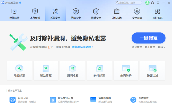2、360安全卫士。360安全卫士的工具箱,包含驱动修复、软件修复、主页修复等多种一键修复工具;而且在工具箱中,我们还可以“召唤”人工服务,更加轻松地帮我们解决电脑问题。