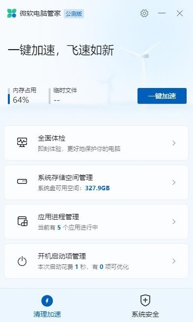 这里财神爷站小编也给大家简单介绍下微软电脑管家目前拥有的功能吧,它目前有电脑体检、存储空间管理、开机加速、快速查杀等功能,可以满足基础的清理与维护。