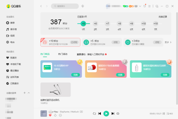 1、参与QQ音乐每日签单活动,每次签到都会有积分奖励;