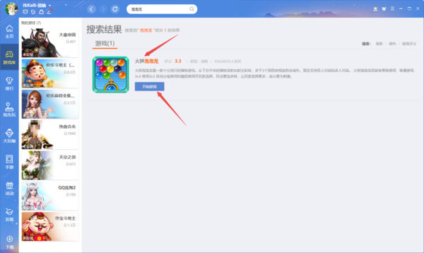 2、紧接着,我们在搜索结果界面中,就可以看到【火拼泡泡龙】这款经典的小游戏了。点击【开始游戏】按钮。