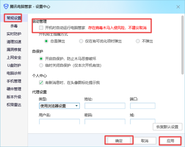 ③接着,软件就会弹出设置中心窗口了,在此窗口默认的【常规设置】选项的右侧界面中,我们便可以看到【启动管理】选项下的【开机时启动运行电脑管家】选项,将此选项进行取消勾选,最后再点击【应用】和【确定】按钮,即可关闭电脑管家开机自启动了。