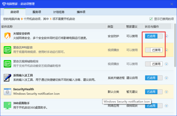 ③接着,软件就会弹出启动项管理界面了,在此界面中,找到想要开机自启或关机开机自启的软件,然后滑动该软件最右侧的【状态与操作】按钮,当软件的【状态与操作】选项变成【已启用】的状态时,说明该软件是开机自启动的状态。而当软件的【状态与操作】选项变成【已禁用】的状态时,说明该软件是开机不自启动的状态了,可以根据自己的实际使用需求来进行设置。