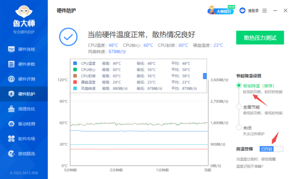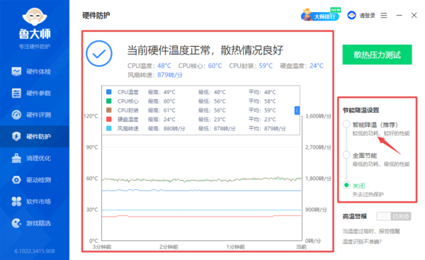 2、紧接着,我们在右侧的界面中,就可以看到电脑当前CPU的温度、硬盘温度、CPU核心、CPU封装、风扇转速以及当前硬件温度是否正常,还有散热的情况等内容了。然后找到右侧界面的【节能降温设置】选项,这里我们选择【智能降温】功能。