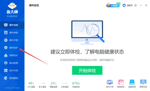 1、启动电脑端的鲁大师软件,然后点击选择左侧列表中的【硬件防护】功能。