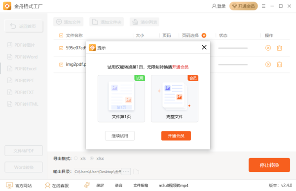 根据财神爷站小编的亲自使用以及查找本站的内容来看,真正免费的能将pdf转换成excel表格的电脑软件是金舟格式工厂,虽然我们不登录不花钱使用该软件只能够转换文档的第一页内容,但是这也能说明它是真正免费的。如果觉得转换效果可以的话,我们就可以去开通软件的会员来进行pdf转excel表格之间的文件转换了,开通软件的会员后,转换是没有限制的。