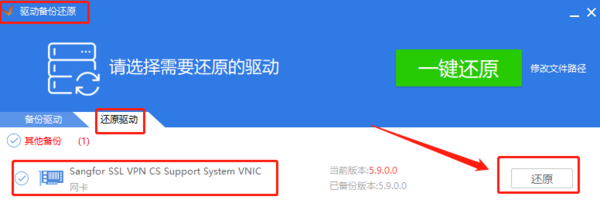 同样是在驱动管理界面,点击上方选项中的驱动备份。在弹出的驱动备份还原界面,选择还原驱动一栏,找到相关的网卡驱动后,选择还原就行了。