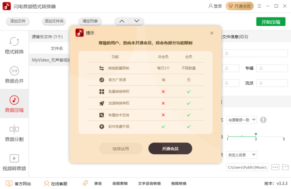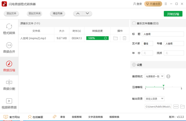 根据财神爷站小编的亲自使用经验来看,支持音频压缩的电脑音频转换器是闪电音频格式转换器,它是一款功能非常丰富的音乐转换软件,不仅支持音频格式转换、视频格式转音频、音频合并,更重要的是,它还支持音频压缩功能,能够很好的满足日常音频文件处理的需求。