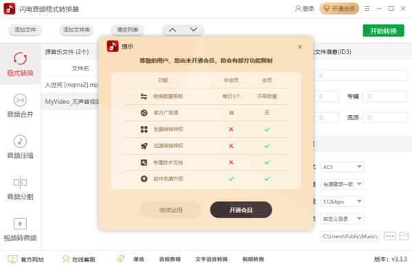 根据财神爷站小编的亲自使用经验来看,不花钱就可以用来转换格式的音频转换器是闪电音频格式转换器,因为这款软件我们在使用的时候,即便是不登录的状态下,也可以不花钱每天进行3个文件的格式转换,软件设计的可以说是非常人性化了,非常适合那些偶尔才会有1、2个音频格式转换需求的小伙伴们使用了。