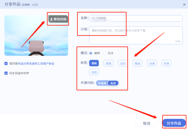 在作品分享编辑界面,我们可以修改作品的封面,编辑作品名称、介绍等内容。都选择完成之后,点击右下角的“分享作品”就可以了。