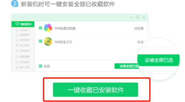 在360软件管家中的收藏功能是将我们当前电脑的软件都保存下来,利用360账号在新电脑中的360软件管家下一键批量安装之前保存过的所有软件。