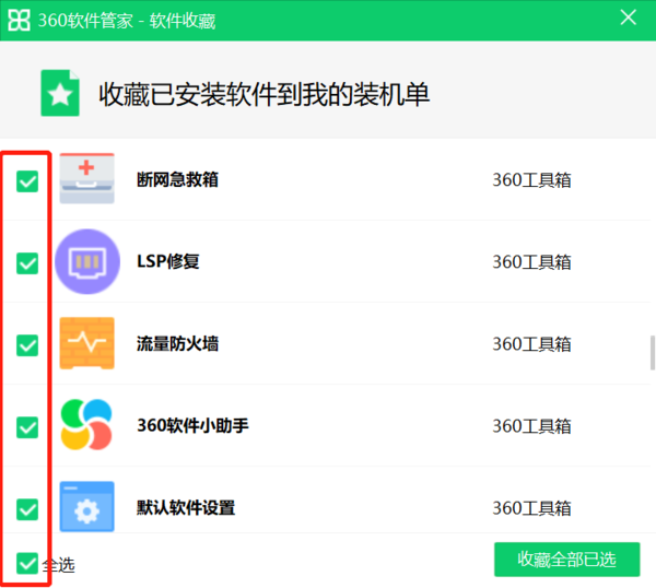 4、最后点击“收藏全部已勾选”即可完成收藏操作啦,当更换新机器时,下载360软件管家并登录360账号,即可在“我的收藏”中看到我们刚刚保存的软件了,一键下载即可~