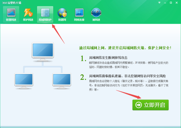 2、接着软件就会弹出【360流量防火墙】的窗口界面了,点击界面顶部的【局域网防护】功能,然后点击【立即开启】按钮。