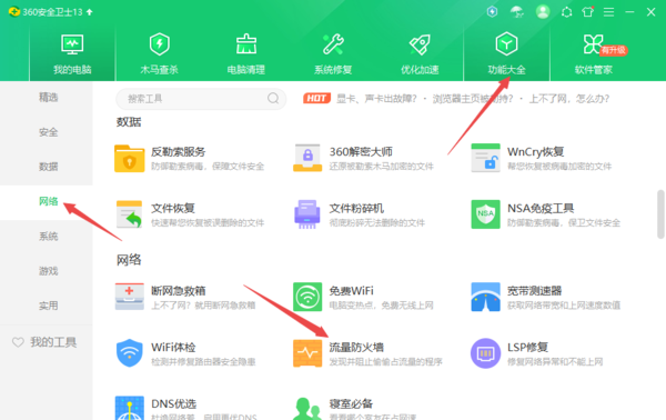 1、启动电脑上的360安全卫士软件,然后点击界面顶部的【功能大全】选项,接着在界面中找到【流量防火墙】功能。