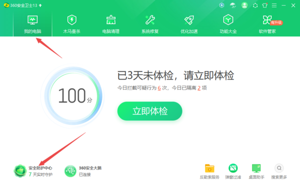 ①启动电脑上的360安全卫士软件,然后在【我的电脑】界面中,点击左下角的【安全防护中心】选项。