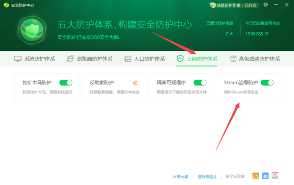 ③然后,在安全防护中心界面中,找到【上网防护体系】选项,再找到【steam盗号防护】功能,将此功能的开关滑动打开,就可以防止steam盗号了。