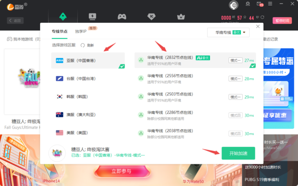 3、紧接着,在弹出的窗口中,选择想要加速的【游戏区域】和【节点】,然后点击【开始加速】按钮。