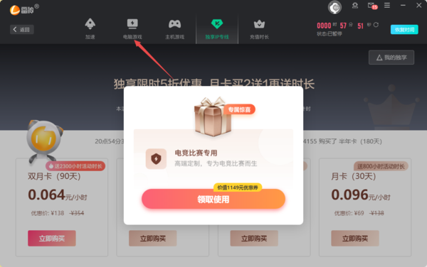 1、启动电脑上的雷神加速器,然后点击界面顶部的【电脑游戏】选项。