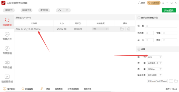 我们只需要将m4a文件添加到软件当然,然后在右侧的输出设置界面中,将输出格式选择成mp3,即可实现电脑m4a文件转变成mp3文件的需求了。