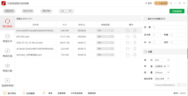根据财神爷站小编的亲自使用以及查找本站内容来看,能把m4a文件转变成mp3文件的电脑软件是闪电音频格式转换器,别看它的名字是音频转换器,但是它也支持视频格式的转换哦,而且支持的格式还是蛮丰富的,其中就拥有m4a和mp3这两种格式。