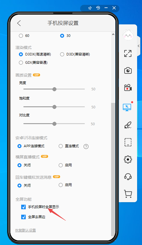 3、最后在手机投屏设置界面当中,找到底部的【手机投屏时全屏显示】选项,然后进行勾选,同时我们也可以将下方的【全屏去黑边】的选项勾选上,这样全屏投屏的效果要更好一些。