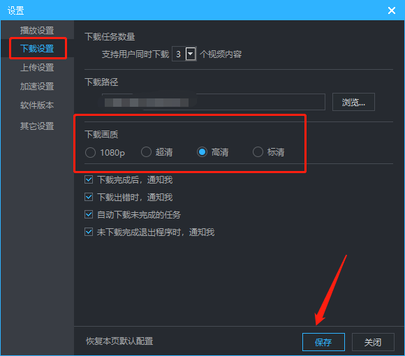 第五步,在下载设置页面内有下载画质,可以将优酷下载视频画质调整成“1080P、超清、高清、标清”模式;