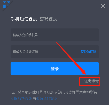 首先在电脑上打开央视影音,点击主页面右上方的头像图标,进入用户个人界面。如果之前没有登录过账号,就点击下方的“登录/注册”键。在弹出窗口中,点击左上角的电脑图标,再选择“注册账号”字样。