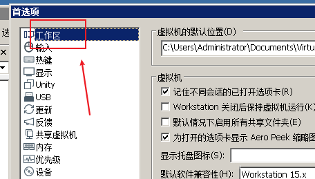第三步:在首选项界面,点击左侧的工作区,如图: