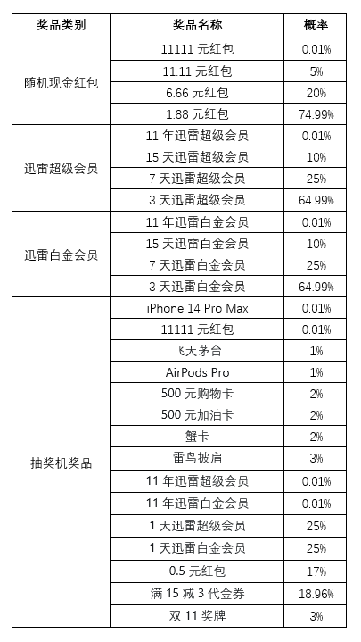 本次活动,迅雷官方按照相关规定要放出了所有奖品的抽奖概率,我将图放在了下方: