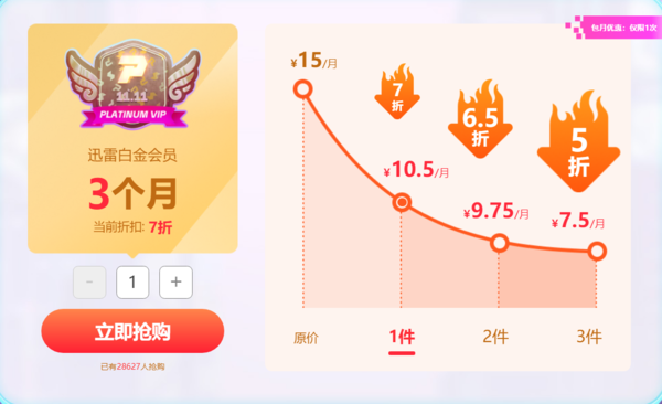 3月白金会员7折优惠共:31.5元(每月10.5元)
