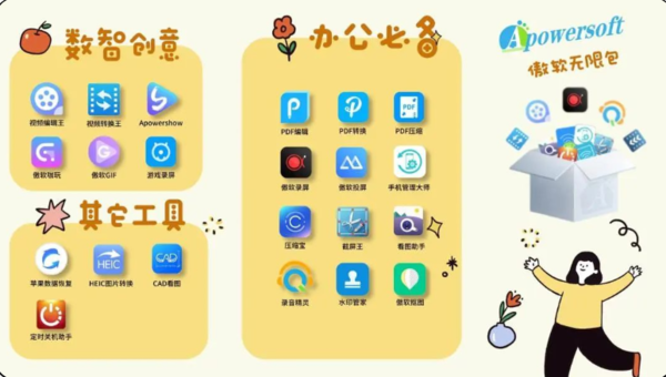 傲软无限包是傲软系列软件20+款软件捆绑发售,个个都是非常实用的办公日常软件,比如傲软PDF编辑、转换、傲软录屏、水印管家、傲软抠图等使用频率很高的必备软件。
