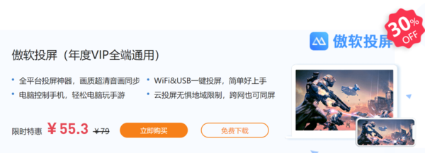 傲软投屏原价1年vip79元的价格,本次活动直接7折优惠价:55.3元。