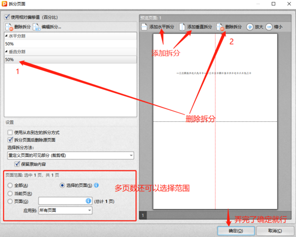 ③接着,我们在【拆分页面】界面,如果我们想添加拆分,就点击【添加水平拆分】或【添加竖直拆分】,而且,我们拖动预览图中的【虚线】,可以自定义拆分比例;如果我们想删除拆分,就先选中已添加的拆分,接着点【删除拆分】即可。此外,对于多页面的拆分,我们可以在界面左下方自由选取应用拆分的范围。