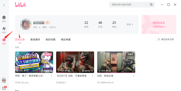 首先,我们打开哔哩哔哩,然后点击左侧模块栏中【我的】;进入该模块后,映入眼帘的就是哔哩哔哩的历史记录,在此我们即可浏览之前看过的视频;甚至是自己看视频的进度,都可以看的一清二楚。